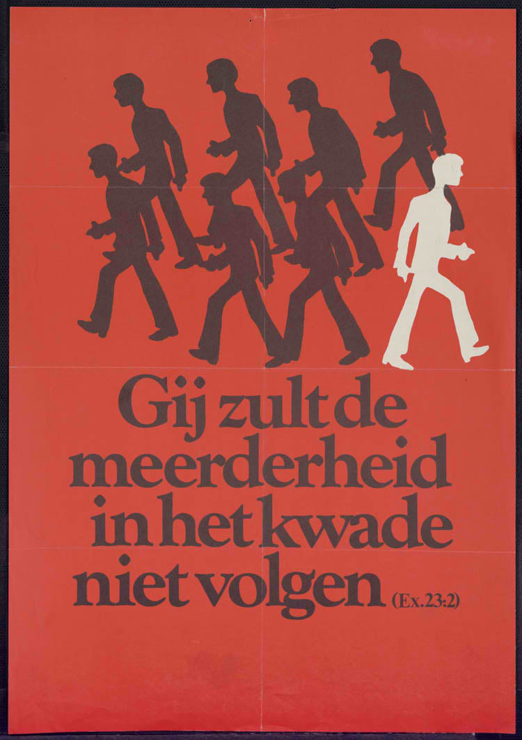 Jezus noemt de mensen "schapen" en we zijn dat ook. We volgen instinctief de meerderheid. Soms is dat goed en soms is dat ronduit slecht. Deze drang naar 'conformiteit' zit in de menselijke psyche en is zelfs sterk instinctief. Echter, "Gij zult de meerderheid in het kwade niet volgen" (Exodus 23:2) zijn woorden die ons moeten sturen tégen deze conformiteitsdrang in. Deze woorden staan in het midden van een tekst over eerlijke rechtspraak en een rechtvaardige levensstijl. Enkel mensen die gekozen hebben om ten allen tijde de Waarheid te volgen en door Jezus geraakt zijn, zijn in staat om dat in hun leven toe te passen. Dat is heel iets anders dan 'burgerlijk conform' zijn aan 'de regels', want als het er écht op aankomt, zal je deze 'regels' - juist dan - niet gehoorzamen.